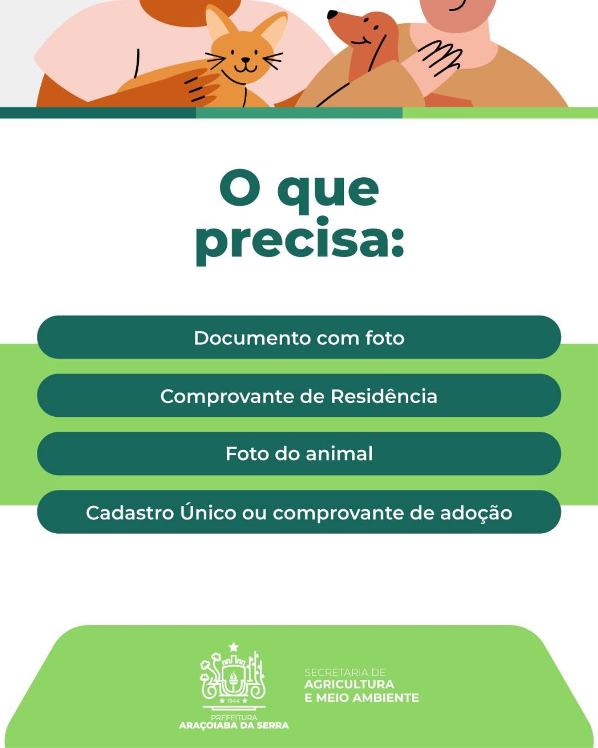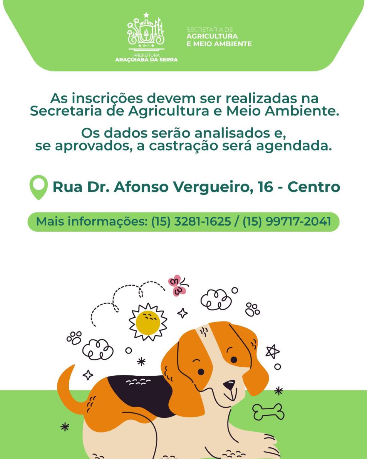 A Campanha de Castração já está com inscrições abertas em Araçoiaba da Serra. Interessados devem comparecer à Secretaria de Agricultura e Meio Ambiente (SAMA), localizada na Rua Dr. Afonso Vergueiro, 16. Para participar, é necessário apresentar documento com foto, comprovante de residência, folha do Cadastro Único (para famílias com renda de até 2 salários mínimos) e foto do(s) animal(is), após a verificação dos documentos, a castração do animal será agendada. Os pets devem ter mais de 5 meses, estar saudáveis e, no caso das fêmeas, não podem estar prenhas ou no cio. Uma ação que promove o cuidado com os animais e reforça a saúde pública. Mais informações pelo telefone (15) 3281-1625/ (15) 99717-2041.