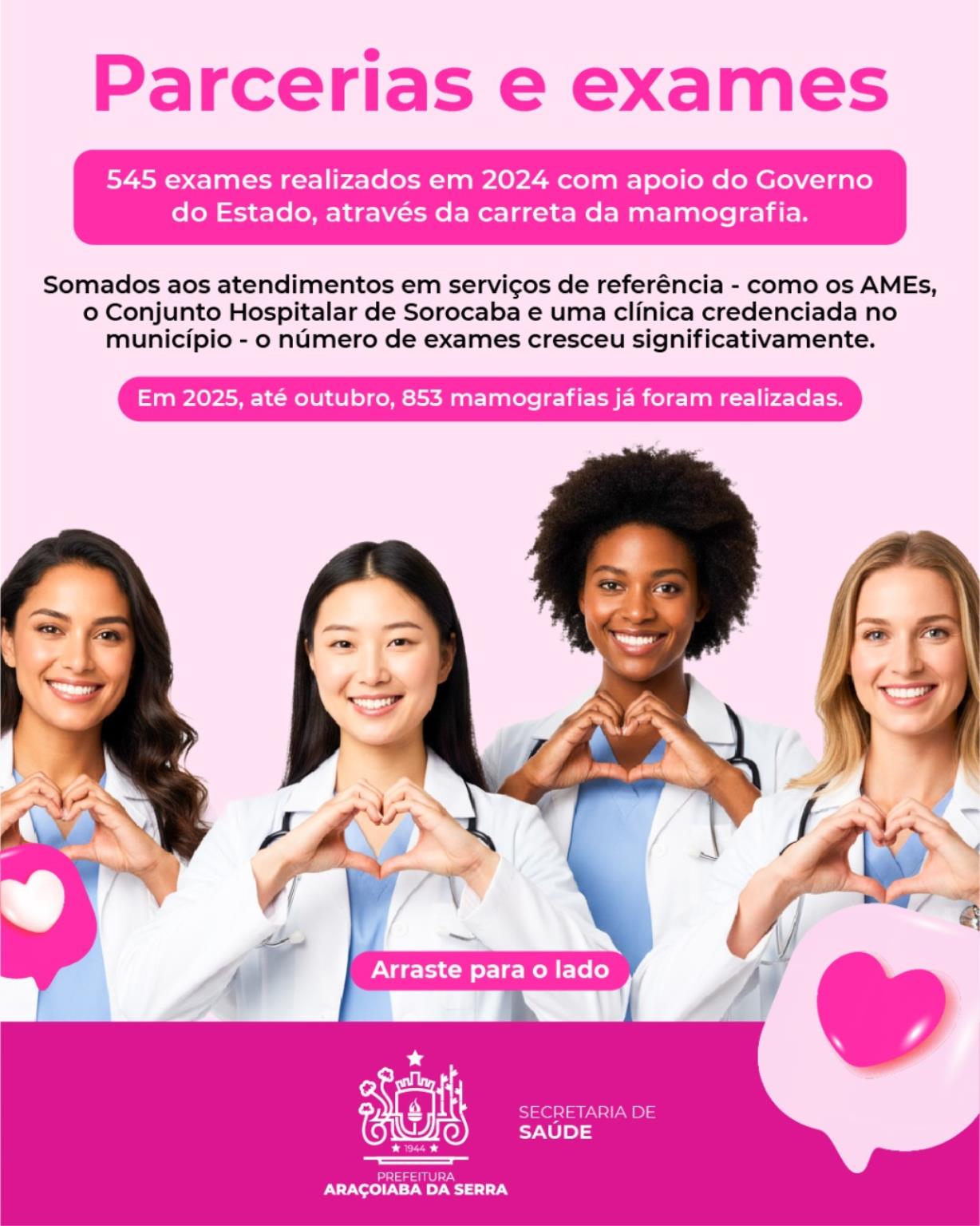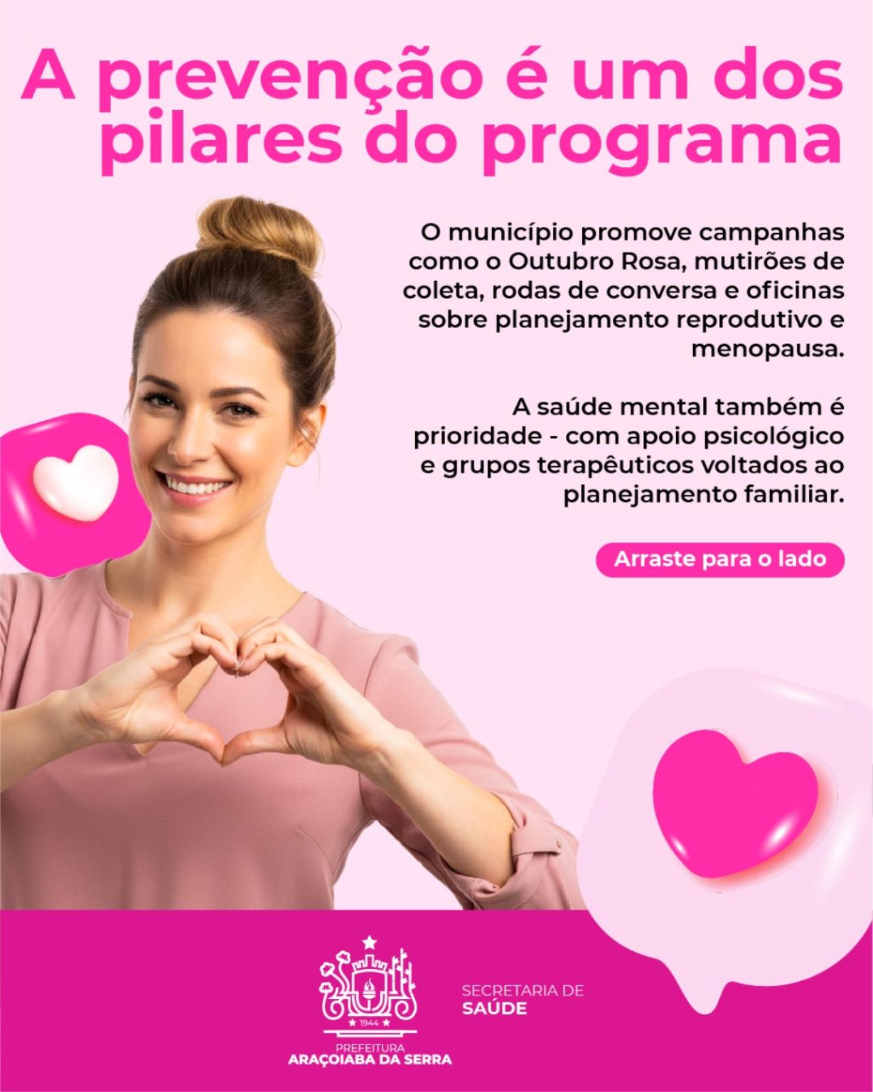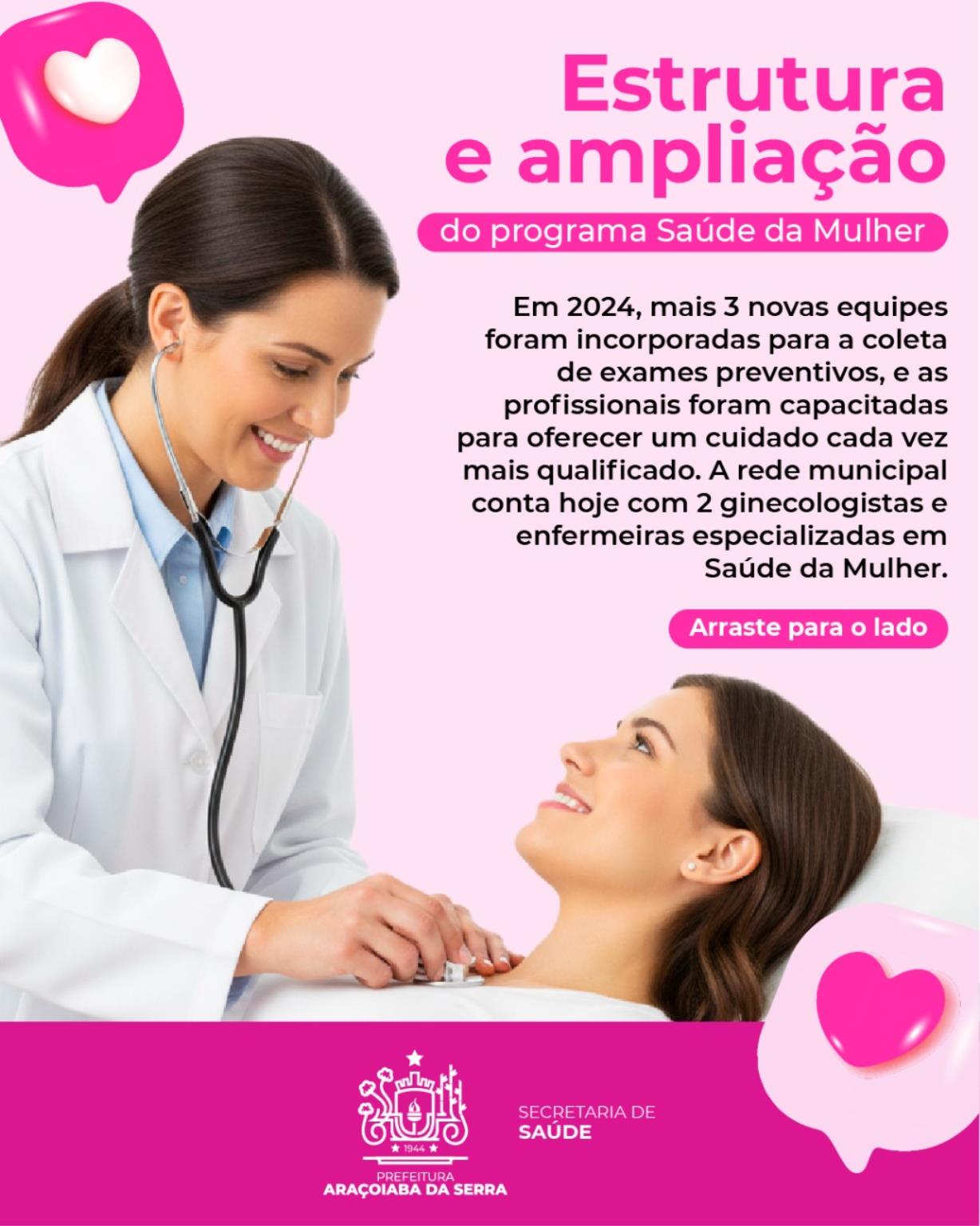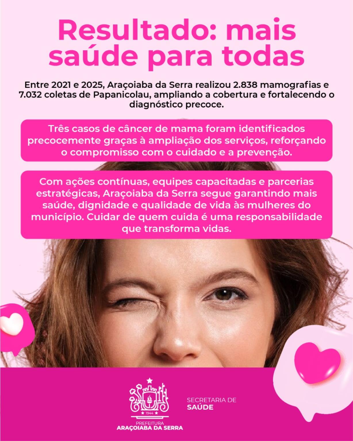 A Prefeitura de Araçoiaba da Serra segue fortalecendo as ações voltadas ao bem-estar feminino, garantindo um cuidado integral em todas as fases da vida. O programa Saúde da Mulher passou por uma ampla reestruturação, com ampliação das equipes, capacitação de profissionais e intensificação das ações preventivas. Campanhas como o Outubro Rosa, mutirões de coleta, rodas de conversa e oficinas sobre planejamento reprodutivo e menopausa reforçam o compromisso com a promoção da saúde e o bem-estar feminino. Entre 2021 e 2025, foram realizadas 2.838 mamografias e 7.032 coletas de Papanicolau, ampliando o acesso, o diagnóstico precoce e a qualidade do atendimento às mulheres de Araçoiaba da Serra.