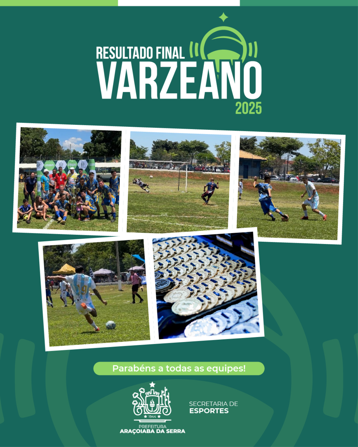 A Prefeitura de Araçoiaba da Serra, por meio da Secretaria de Esporte, divulga o resultado do Campeonato Varzeano de Futebol 2025, realizado entre 03 de agosto e 30 de novembro, com 20 equipes, 76 jogos, 293 gols e cerca de 500 participantes. Na 1ª Divisão, o Noguerense F.C foi campeão e também venceu o 1º turno, com a melhor defesa e Amarildo Gabriel Ferreira Leão como artilheiro (11 gols/ E.C. Barreiro). Na 2ª Divisão, o C.U. Flamengo ficou com o título após decisão nos pênaltis; o Cristovão F.C. levou o 1º turno, teve a defesa menos vazada e Mathues Gustavo Alves Plens foi artilheiro (8 gols/Jundiacanga F.C.). A premiação “Melhores da Várzea” ocorrerá em 12/12/2025. Parabéns a todos os participantes e campeões!