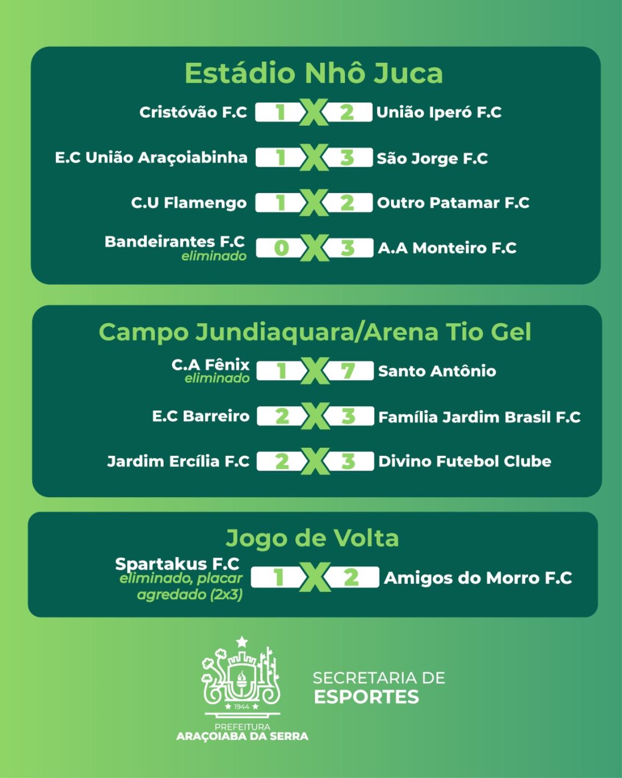 A Prefeitura de Araçoiaba da Serra, por meio da Secretaria de Esportes, Lazer e Juventude, informa que no domingo, 8 de fevereiro, aconteceu a 2ª rodada do Campeonato Intermunicipal de Futebol 2026, com jogos realizados no Estádio Nhô Juca e no Campo Jundiaquara / Arena Tio Gel. A competição reúne 32 equipes da região. Mais informações, tabela completa e atualizações podem ser acompanhadas em copafacil.com/intermunicipal2026.