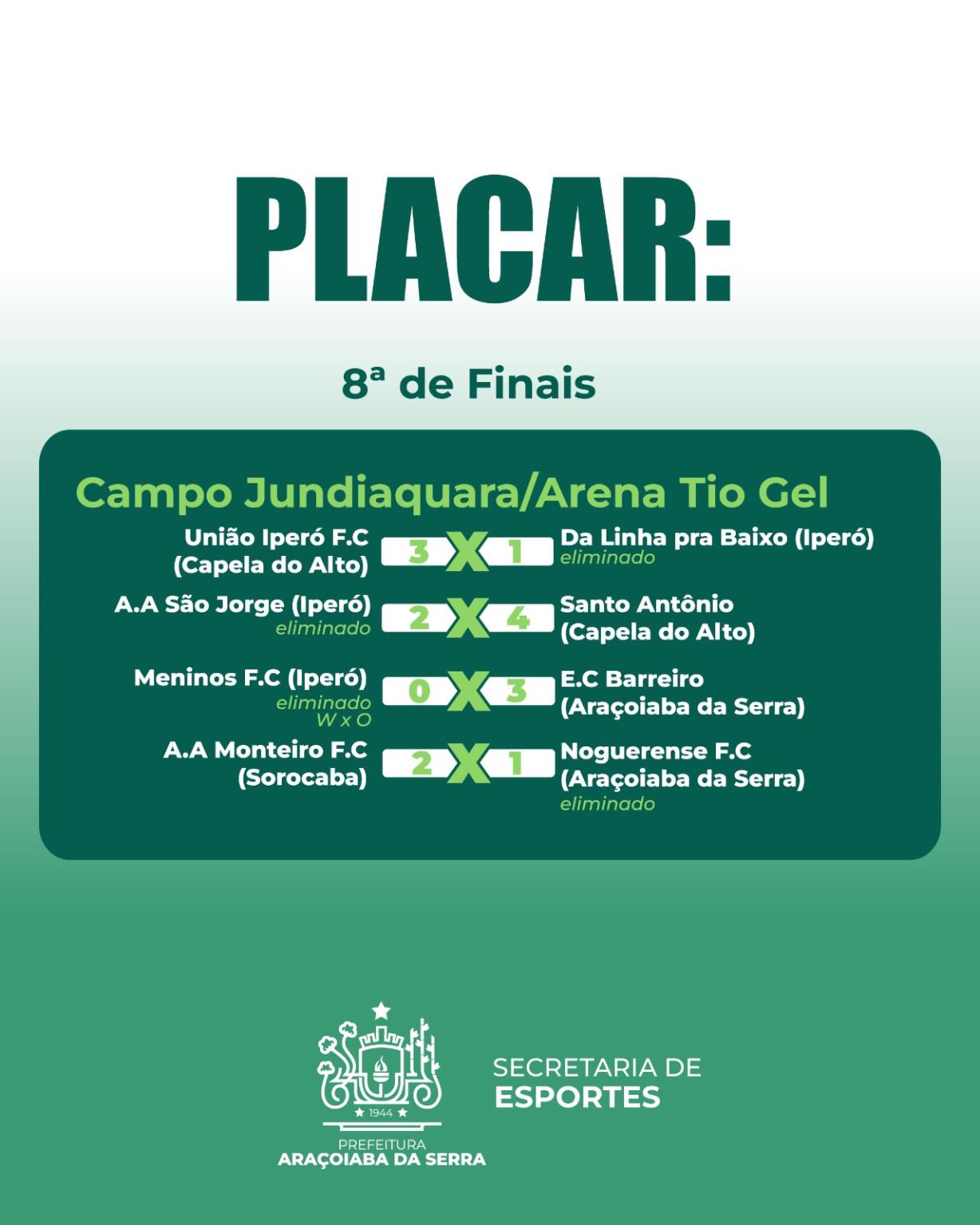 A Prefeitura de Araçoiaba da Serra, por meio da Secretaria de Esportes, Lazer e Juventude, informa que no domingo, dia 22 de março, foi realizada a 7ª Rodada – Oitavas de Final do Campeonato Intermunicipal de Futebol 2026, no Campo de Futebol Jundiaquara (Arena Tio Gel). A competição reúne 32 equipes da região e segue movimentando o esporte no município. Mais informações, tabela completa e atualizações podem ser acompanhadas em copafacil.com/intermunicipal2026