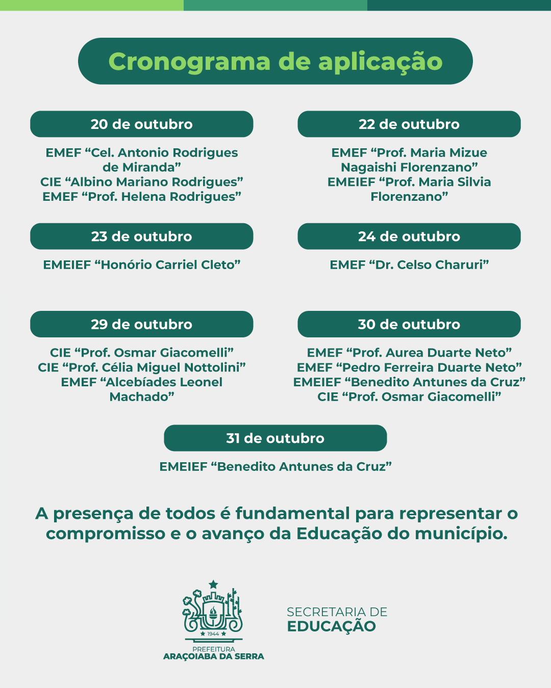 Por isso, é fundamental que todos os estudantes compareçam nos dias de aplicação das provas, mantendo a rotina de sono e alimentação equilibrada. A presença e o empenho de cada aluno fazem a diferença para representar, com justiça e orgulho, o trabalho realizado nas escolas de Araçoiaba da Serra.