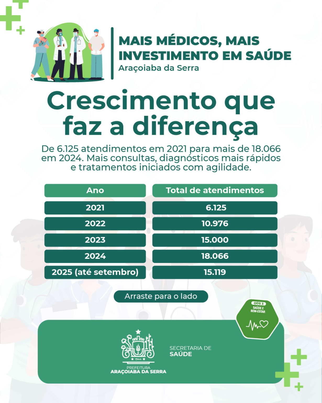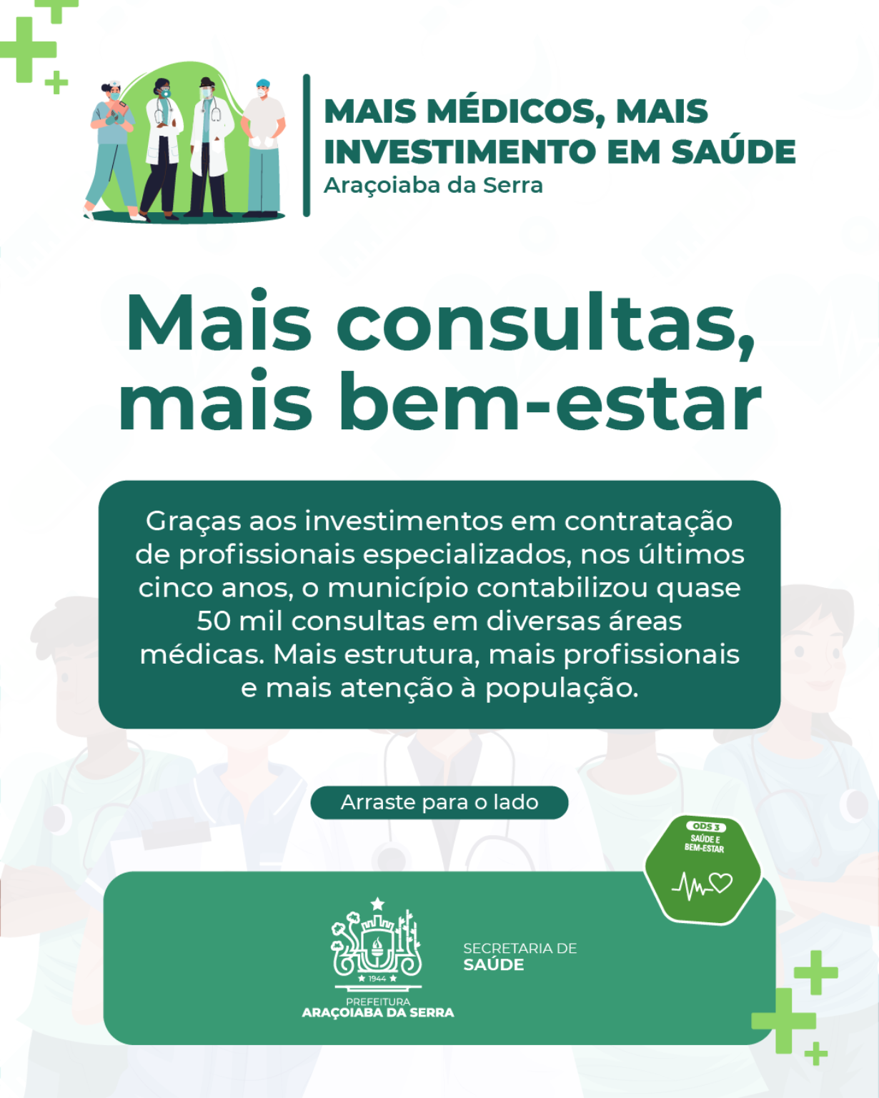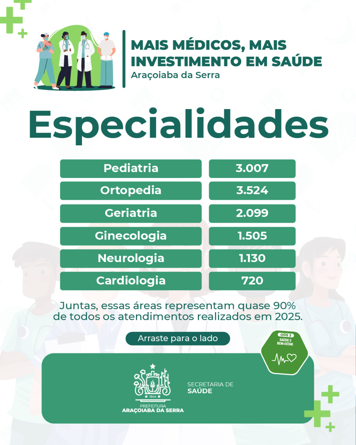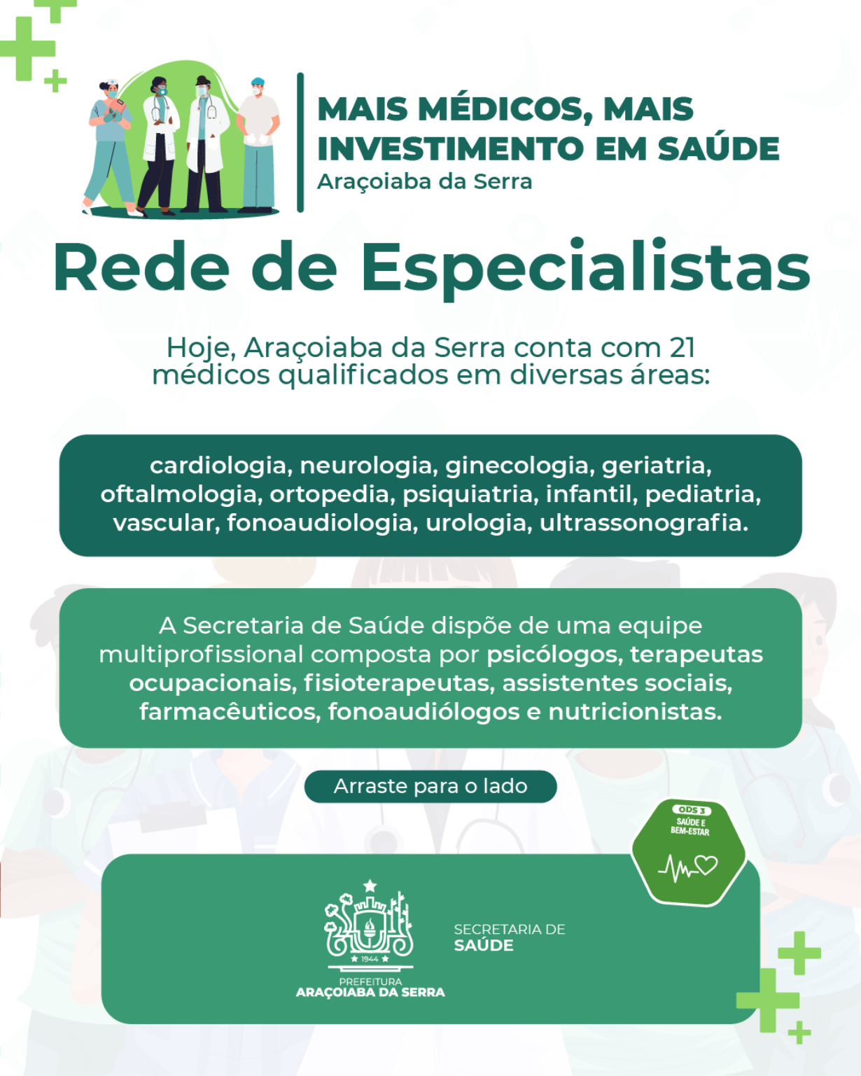 Hoje, são 21 médicos especialistas atuando em diversas áreas, garantindo um atendimento mais completo, rápido e humanizado para toda a população.