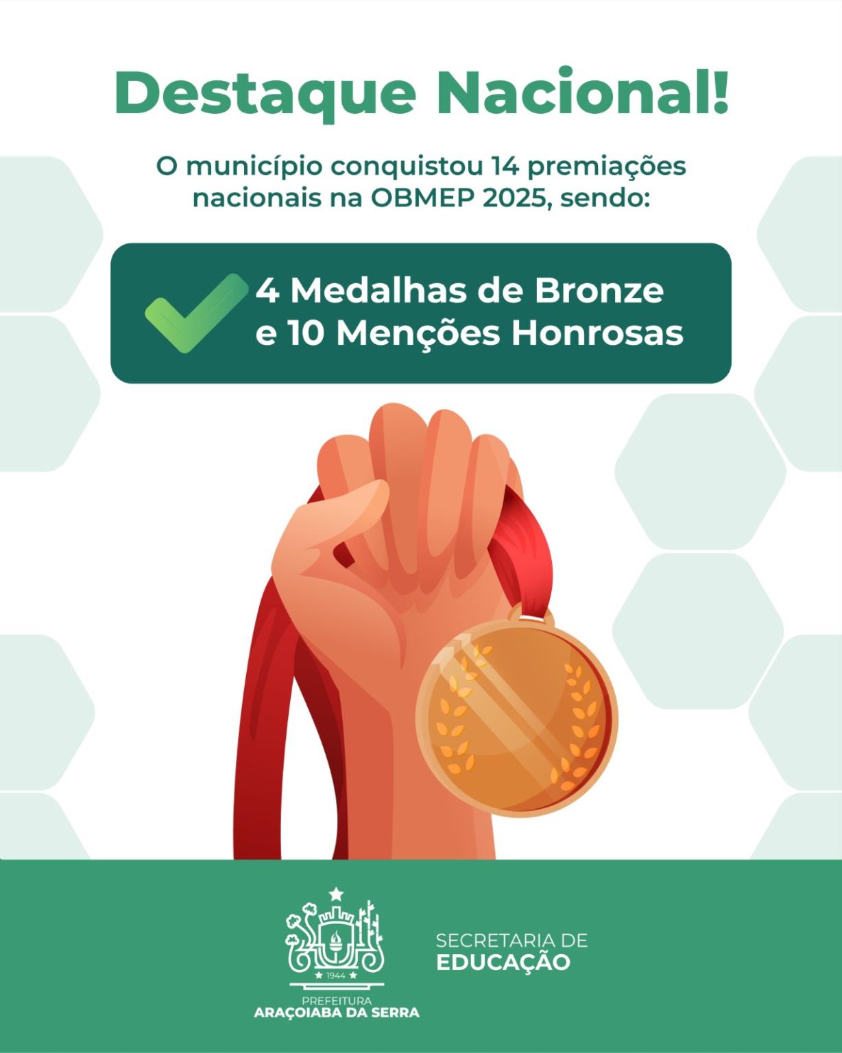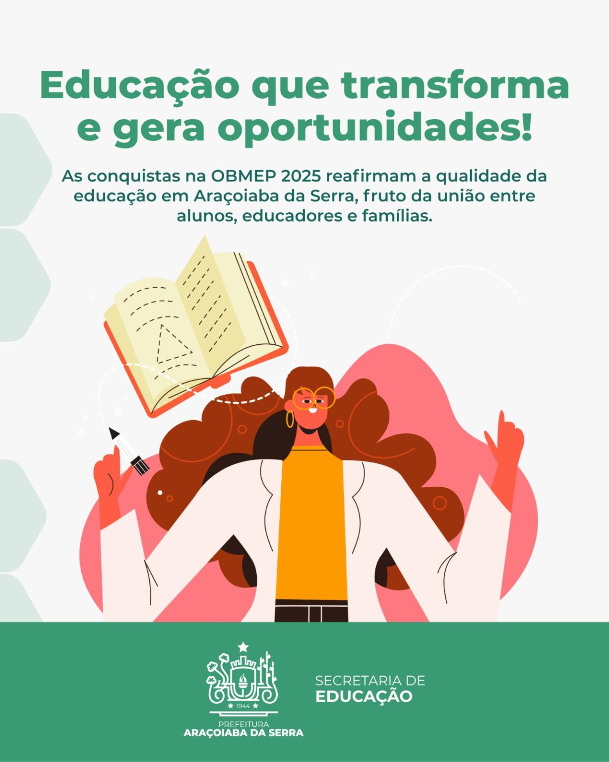 Araçoiaba da Serra segue se destacando na educação pública. O município conquistou 14 premiações nacionais na OBMEP 2025, além de 10 medalhas na etapa estadual, resultado do talento dos alunos, do trabalho dedicado das escolas e do empenho dos educadores. As conquistas reforçam o compromisso da cidade com uma educação de qualidade, que transforma realidades e amplia oportunidades. Parabéns a todos os estudantes premiados, às equipes escolares e às famílias que apoiam essa trajetória de sucesso.