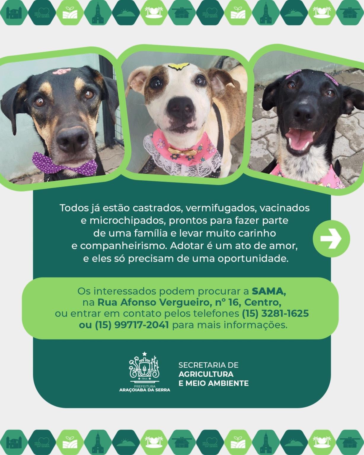 Esses cachorrinhos estão em busca de um novo lar após serem resgatados de um abrigo que foi fechado por maus-tratos. Agora, eles têm a chance de recomeçar com amor, cuidado e dignidade. Todos já estão castrados, vermifugados, vacinados e microchipados, prontos para fazer parte de uma família e levar muito carinho e companheirismo. Adotar é um ato de amor, e eles só precisam de uma oportunidade. Os interessados podem procurar a Secretaria de Agricultura e Meio Ambiente, na Rua Afonso Vergueiro, nº 16, Centro, ou entrar em contato pelos telefones (15) 3281-1625 ou (15) 99717-2041 para mais informações.