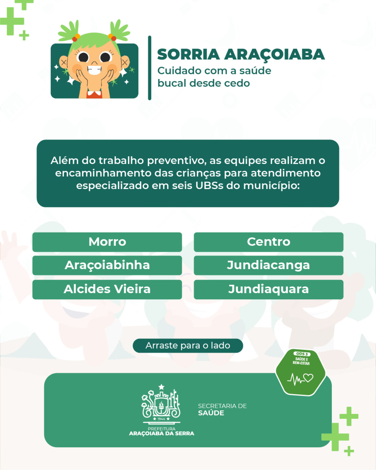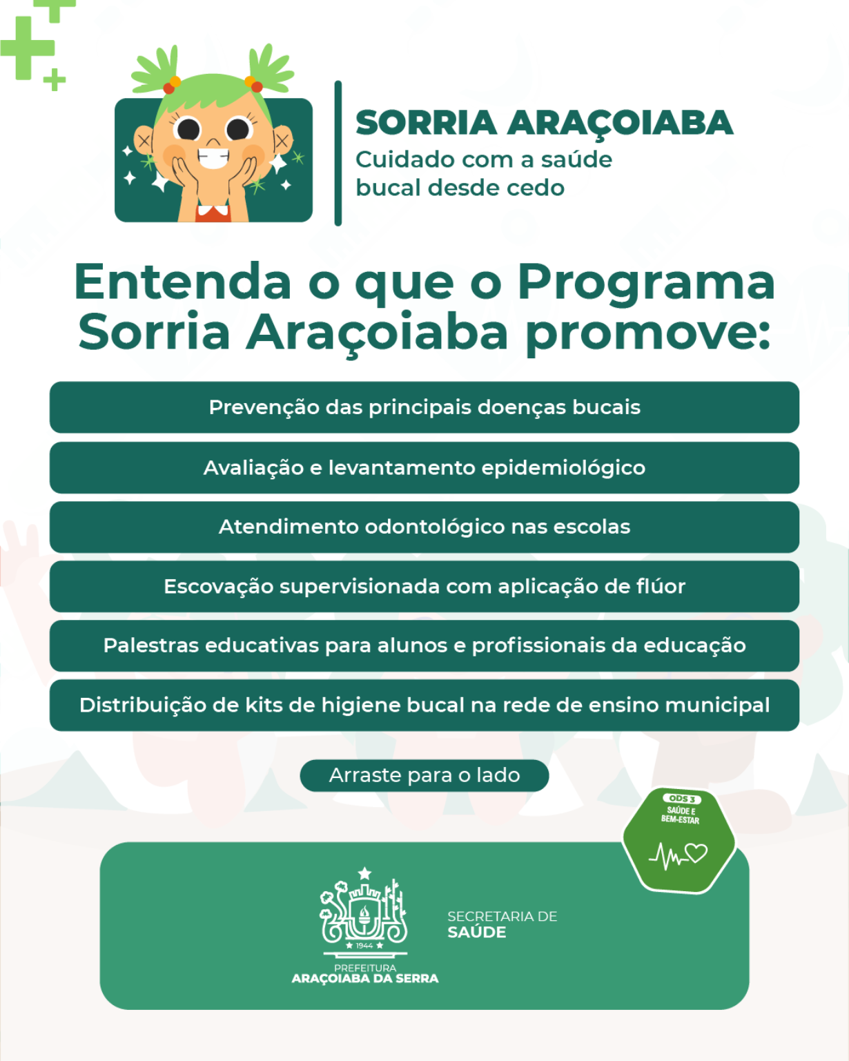A Prefeitura de Araçoiaba da Serra, por meio das Secretarias de Saúde e Educação, segue cuidando da saúde bucal dos alunos da rede municipal com o Programa Sorria Araçoiaba. Desde o início do programa, em 2023, já foram entregues cerca de 12.700 kits de higiene bucal para todas as creches e alunos do Ensino Infantil, Fundamental I e II.