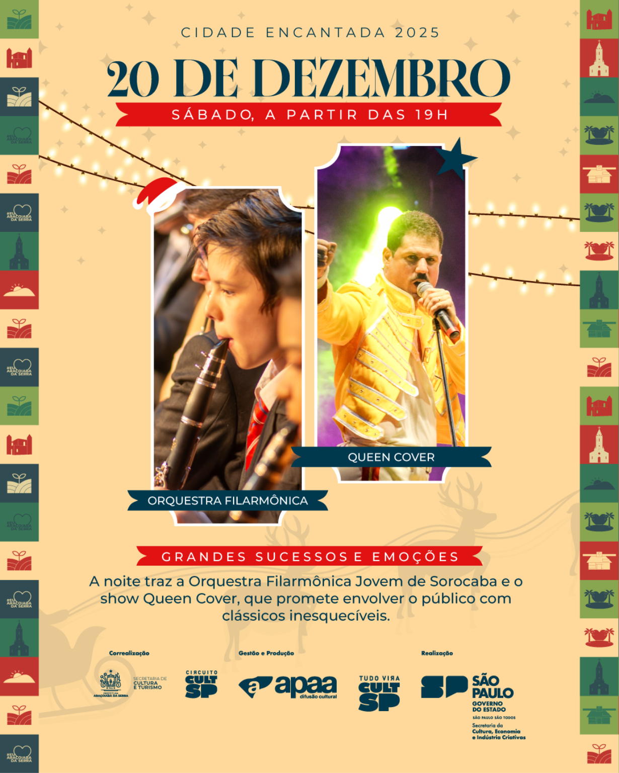 O Natal Cidade Encantada 2025 irá transformar a Praça Coronel Almeida em um espaço de celebração e magia, reunindo apresentações culturais, música, teatro, personagens e momentos especiais para toda a família. Além da programação artística, o público poderá aproveitar as delícias da praça de alimentação e as opções de lazer para as crianças, como o tradicional carrossel, que deixa o clima ainda mais encantador. Uma experiência completa para viver a alegria e o espírito natalino em Araçoiaba da Serra.