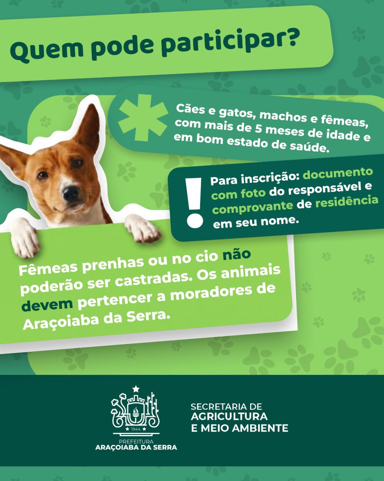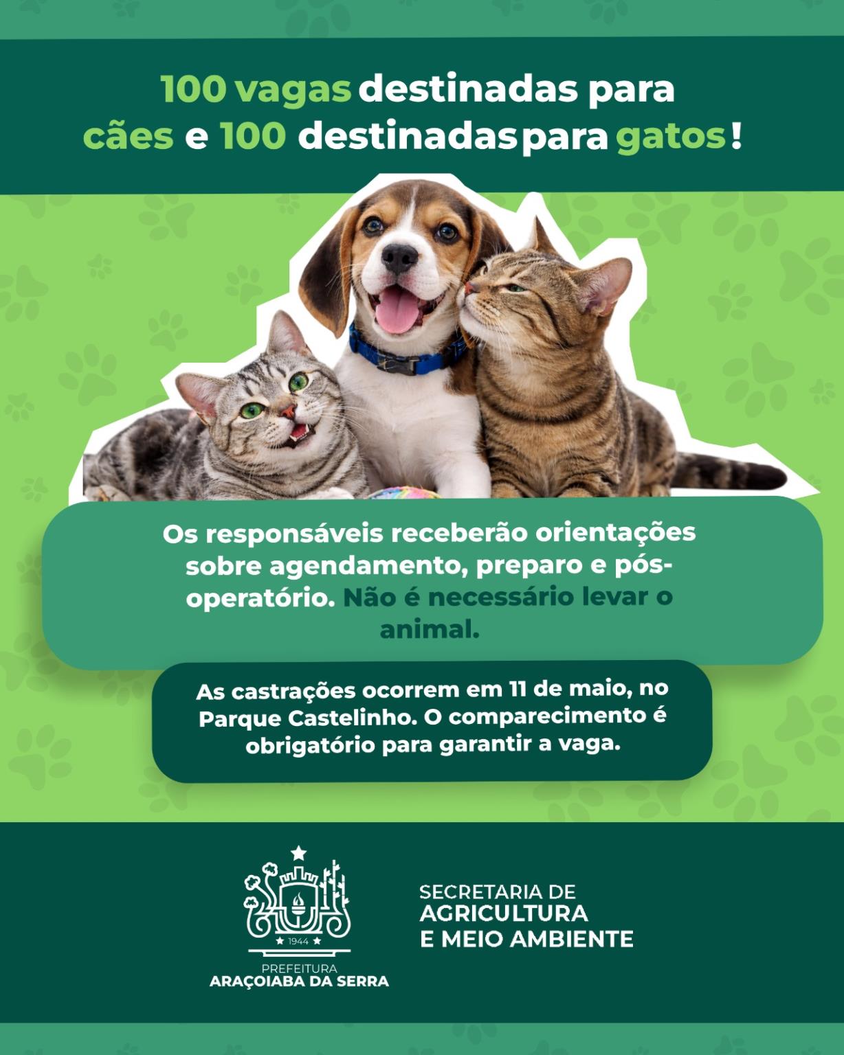 A Prefeitura de Araçoiaba da Serra, por meio da Secretaria de Agricultura e Meio Ambiente, informa que estarão abertas, de 15 de abril a 8 de maio (ou até o preenchimento das vagas), as inscrições para o programa Castra Móvel. O atendimento será realizado das 8h30 às 16h00, na sede da Secretaria, localizada na Rua Afonso Vergueiro, nº 16, Centro. Para a inscrição, é necessário apresentar documento com foto e comprovante de residência em nome do responsável pelo animal. Poderão participar cães e gatos, machos e fêmeas, com mais de 5 meses de idade e em bom estado de saúde, sendo que fêmeas prenhas ou no cio não poderão ser castradas, e os animais devem pertencer a moradores do município. Serão disponibilizadas 200 vagas, sendo 100 destinadas a cães e 100 a gatos. No momento da inscrição, os responsáveis receberão orientações sobre o agendamento, preparo para a cirurgia e cuidados no pós-operatório, não sendo necessário levar o animal nesta etapa. As castrações serão realizadas no dia 11 de maio, no Parque Castelinho, e a Prefeitura reforça a importância do comparecimento na data agendada para evitar a perda de vagas e garantir o bom andamento da ação.