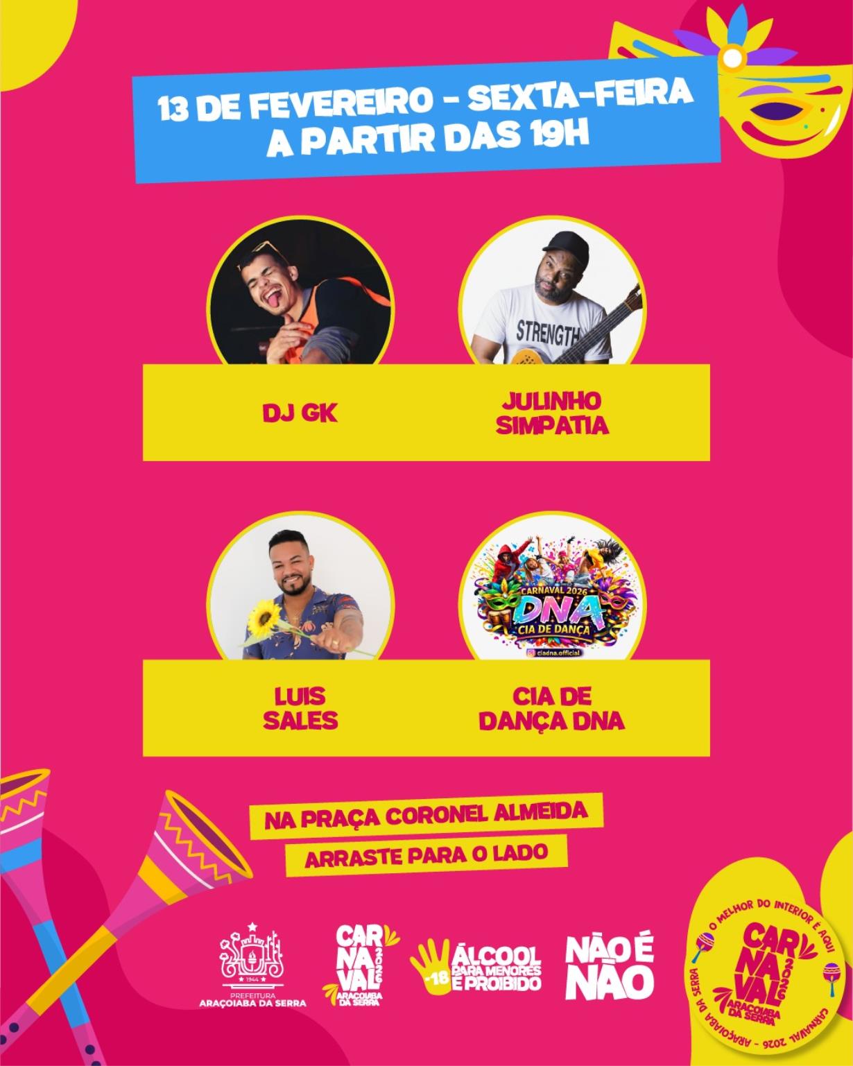 A abertura do Carnaval de Araçoiaba da Serra acontece na sexta-feira, dia 13 de fevereiro, a partir das 19h, com apresentações de DJ GK, Julinho Simpatia, Luis Sales e da Cia de Dança DNA.