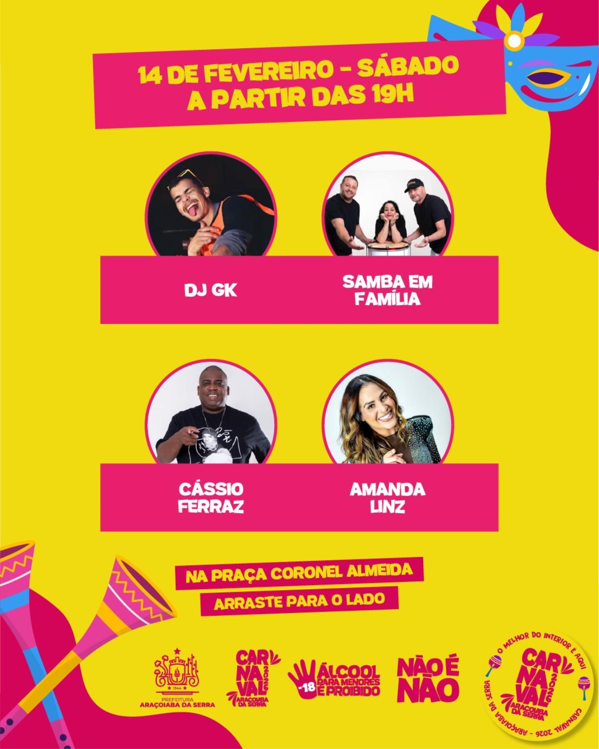 No sábado, dia 14 de fevereiro, a programação inicia às 19h, com shows de DJ GK, Samba em Família, Cássio Ferraz e Amanda Lins
