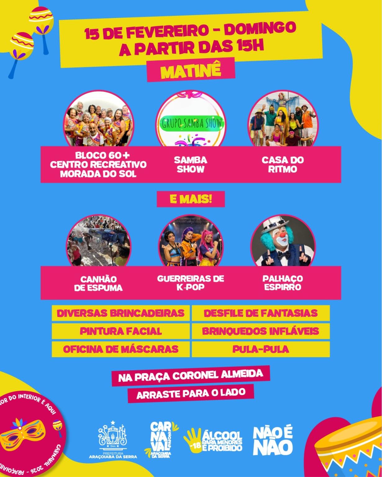 No domingo, dia 15 de fevereiro, das 15h às 18h, ocorre a matinê infantil, com pocket show Guerreiras do K-pop e atividades recreativas como canhão de espuma, pintura facial, oficina de máscaras, desfile de fantasias e brinquedos infláveis. O Palhaço Espirro também participa da programação infantil. À noite, após o intervalo para a missa, as atrações retornam às 20h com o Bloco 60+ Centro Recreativo Morada do Sol, Samba Show e Casa do Ritmo.