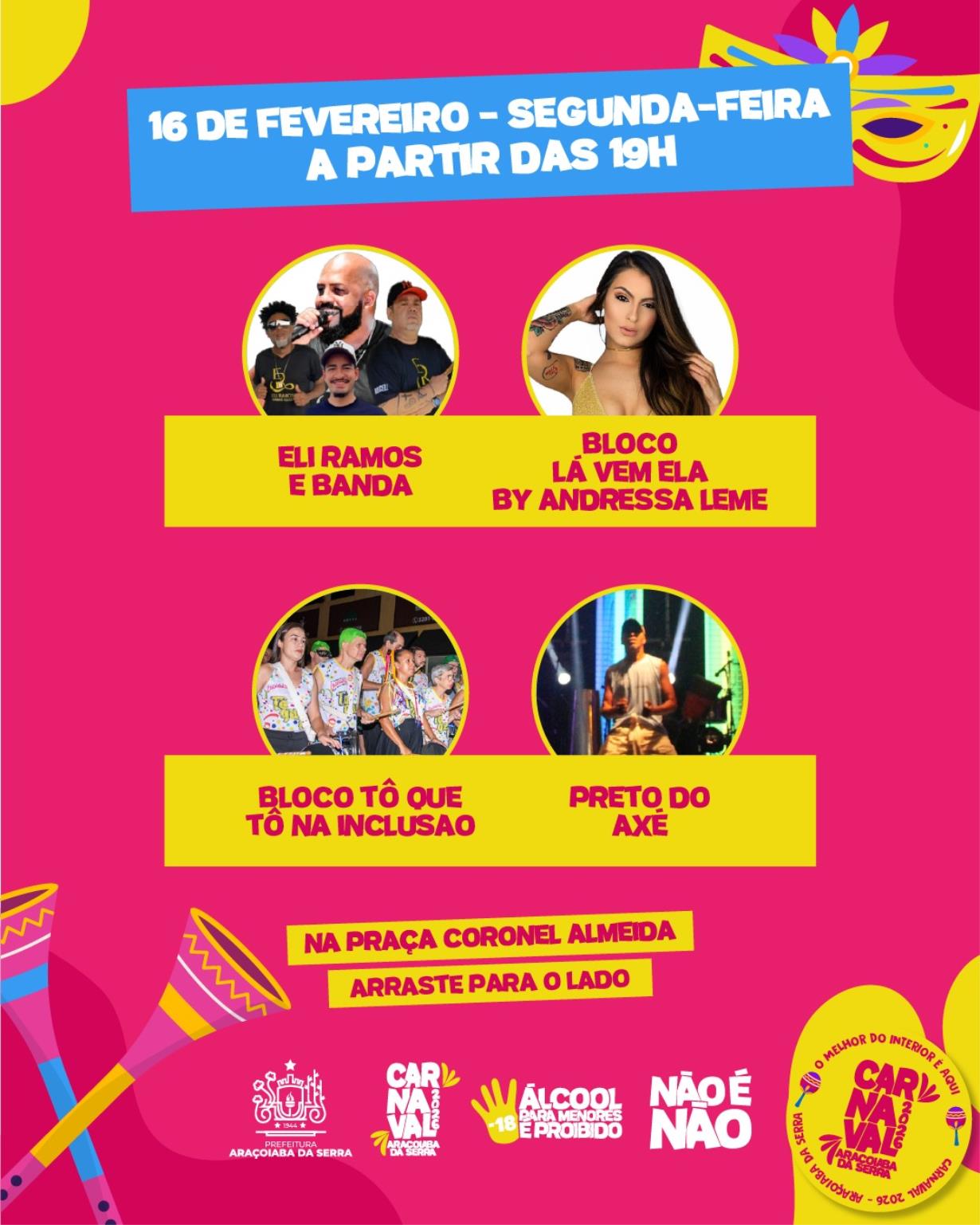Na segunda-feira, dia 16 de fevereiro, a programação começa às 19h com o Bloco Tô que Tô na Inclusão, além dos shows de Eli Ramos e Banda, Andressa Leme e Banda e Preto do Axé. O Palhaço Espirro integra novamente a programação.