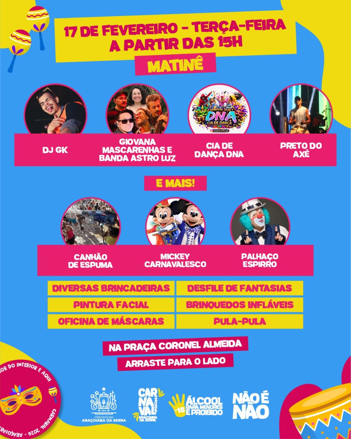 O encerramento ocorre na terça-feira, dia 17 de fevereiro, com matinê a partir das 15h, incluindo pocket show Mickey Carnavalesco e diversas atividades recreativas para o público infantil. À noite, a programação segue com DJ GK, Giovana Mascarenhas e Banda Astro Luz, Cia de Dança DNA e Preto do Axé, com encerramento previsto para às 20h.