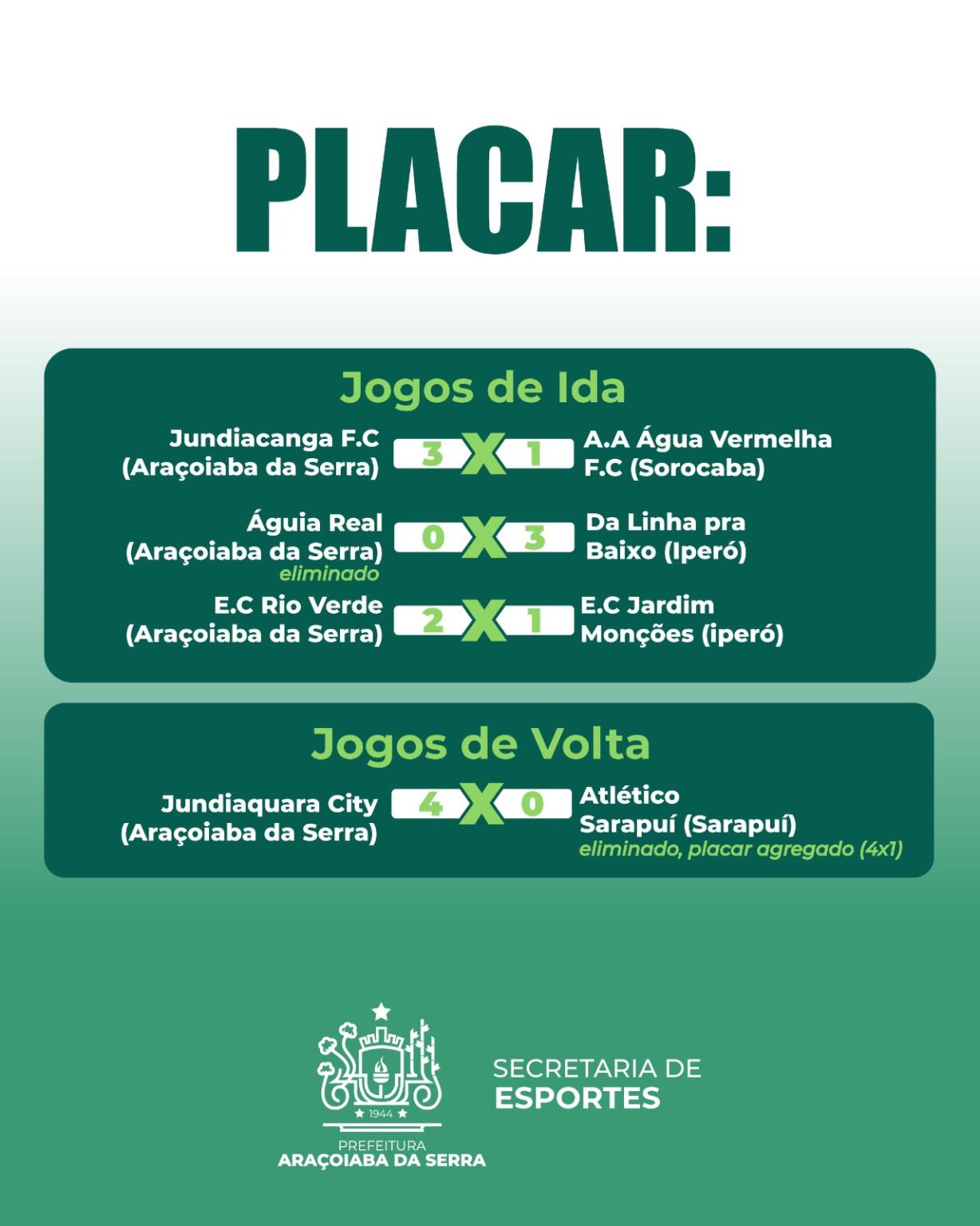 A Prefeitura de Araçoiaba da Serra, por meio da Secretaria de Esportes, Lazer e Juventude, informa que no domingo, 22 de fevereiro, foi realizada a 3ª rodada do Campeonato Intermunicipal de Futebol 2026, no Campo de Futebol Jundiaquara (Arena Tio Gel). A competição reúne 32 equipes da região. Mais informações, tabela completa e atualizações podem ser acompanhadas em [copafacil.com/intermunicipal2026](http://copafacil.com/intermunicipal2026).