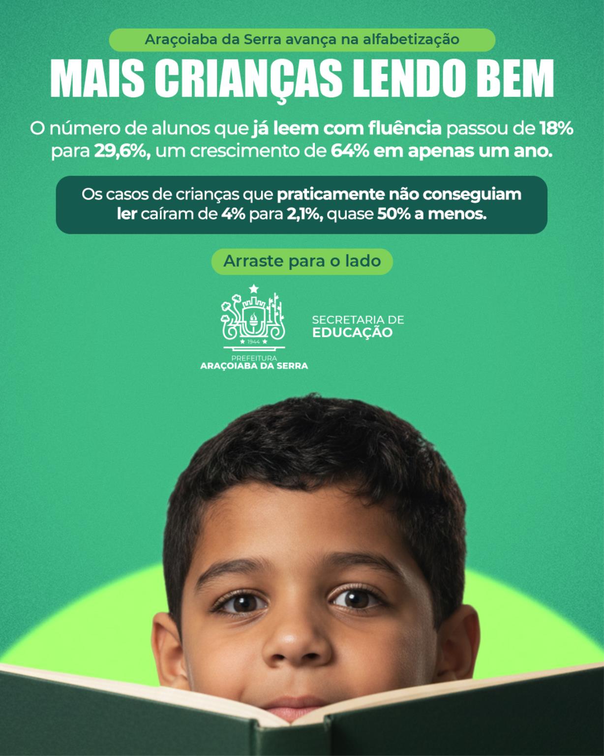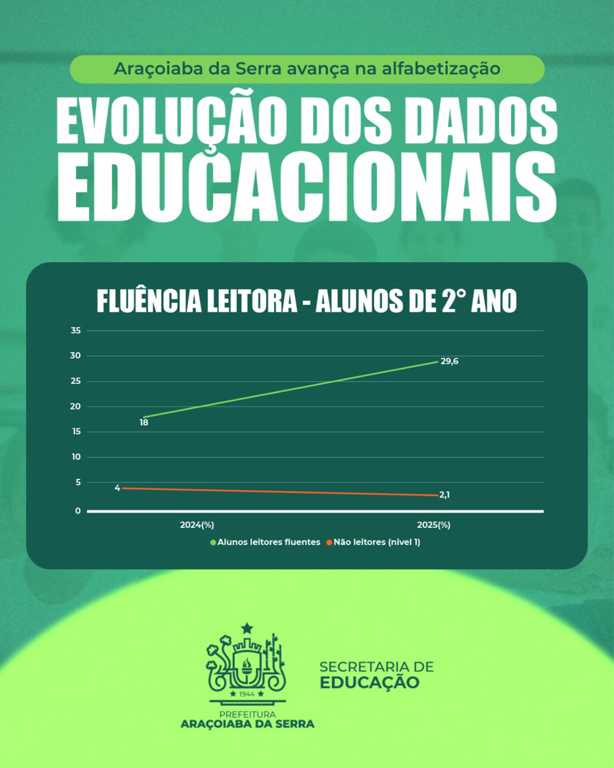 A Prefeitura de Araçoiaba da Serra, por meio da Secretaria de Educação, avançou de forma significativa na alfabetização das crianças do 2º ano do Ensino Fundamental. Dados oficiais de fluência leitora mostram que, de 2024 para 2025, o município ampliou o número de alunos que já leem com fluência, passando de 18% para 29,6% em apenas um ano. Esse crescimento representa um avanço de 64% no número de crianças que já leem bem.