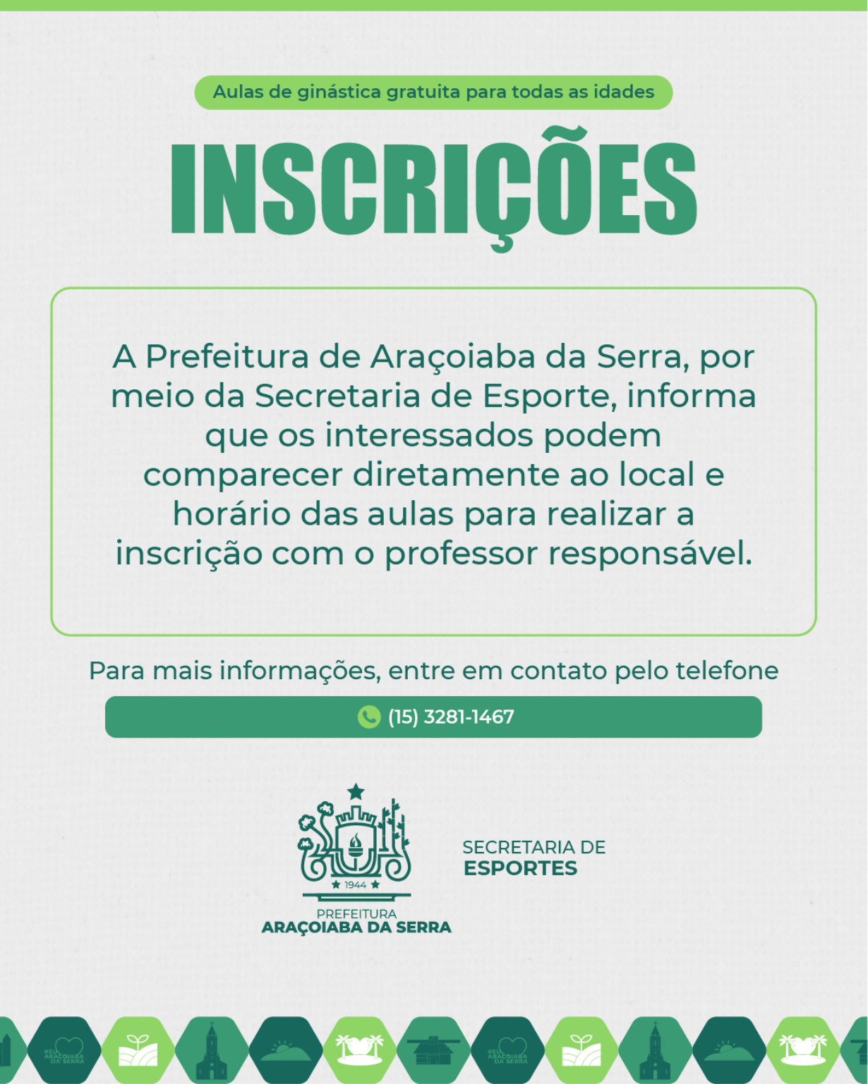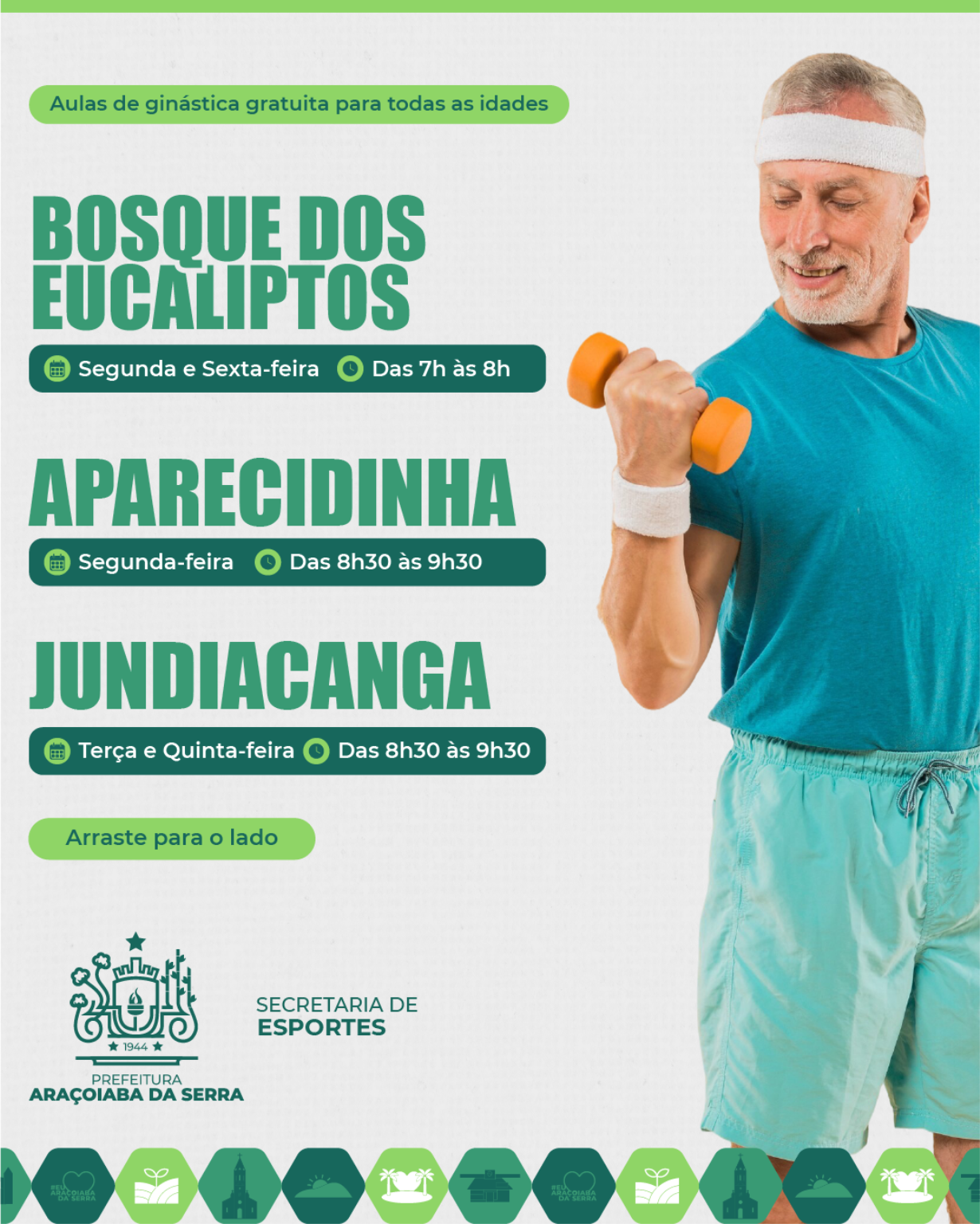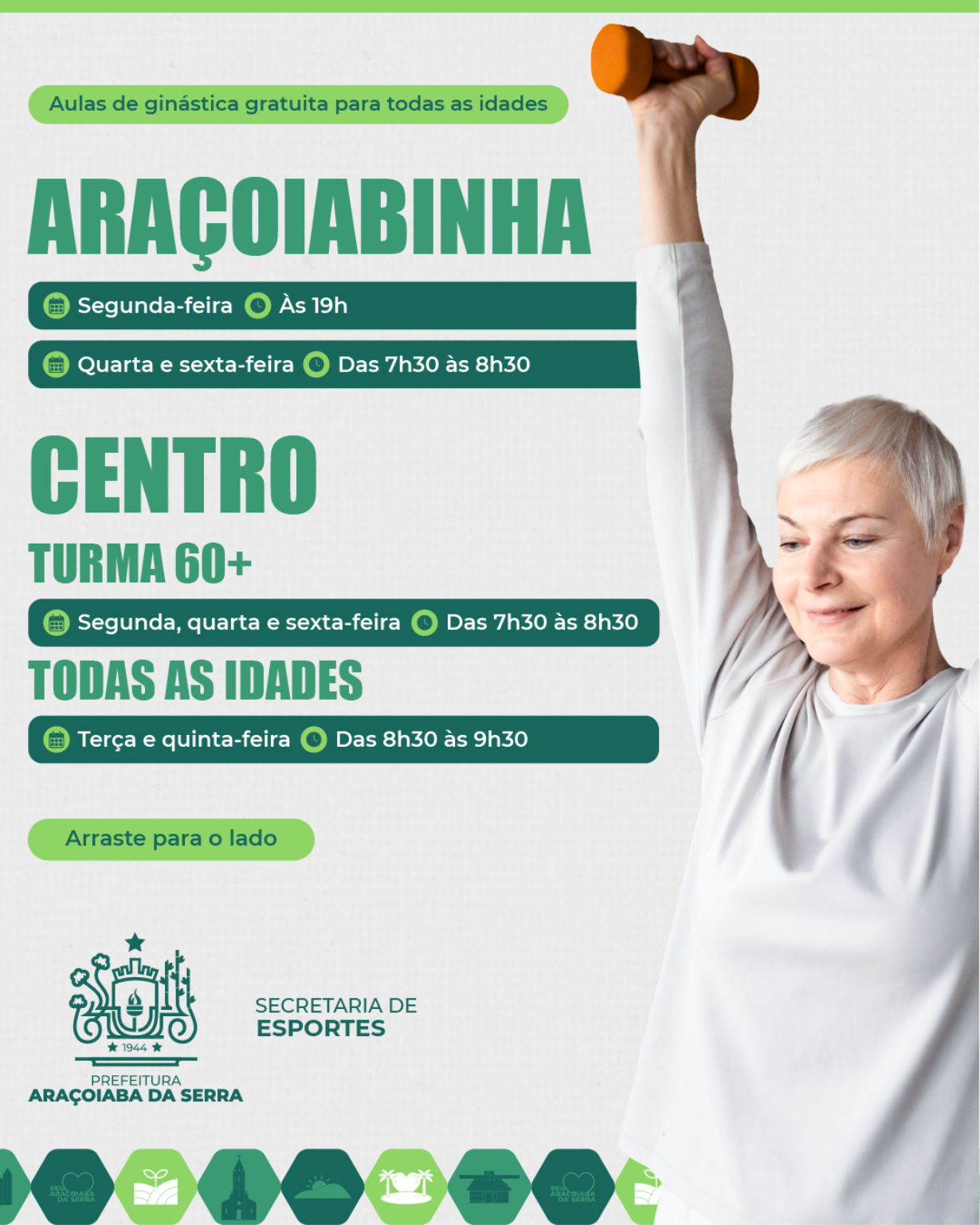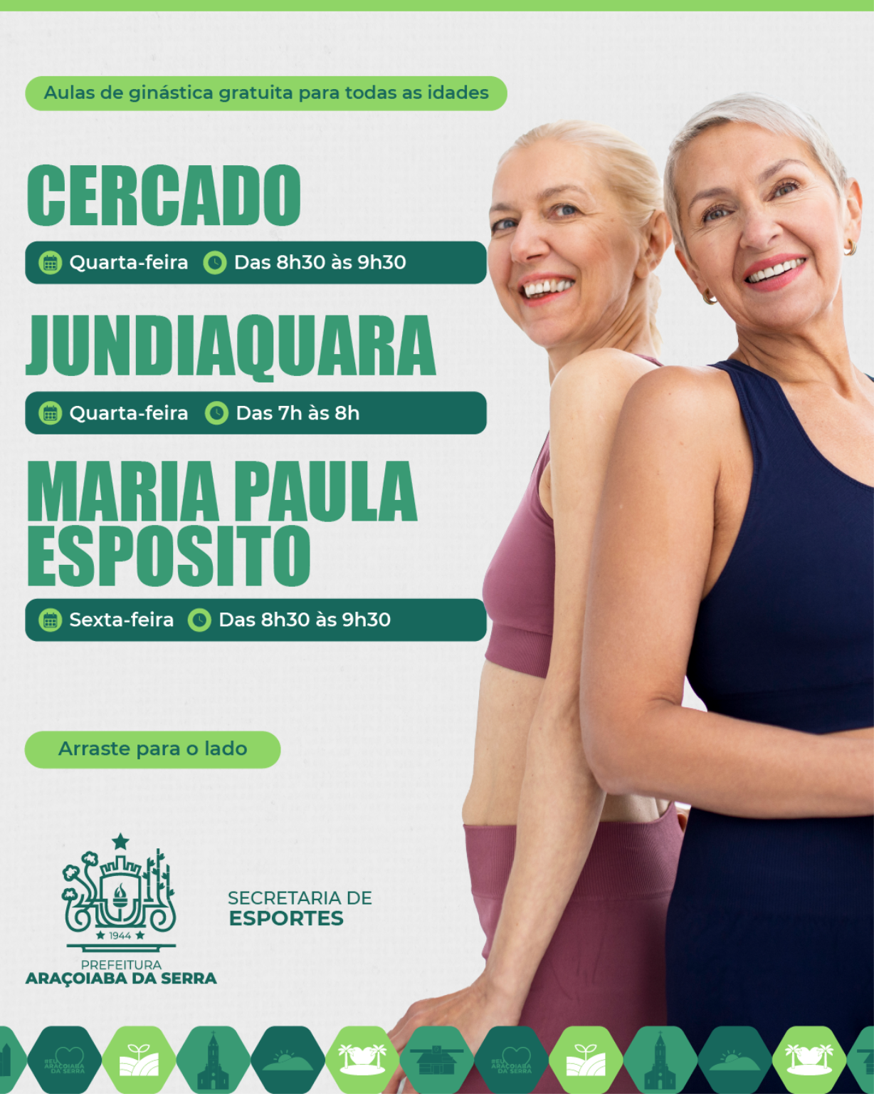 A Prefeitura de Araçoiaba da Serra, por meio da Secretaria de Esportes, informa que oferece aulas gratuitas de ginástica em diversos bairros do município, com o objetivo de incentivar a prática de atividades físicas, promover a saúde e melhorar a qualidade de vida da população. As aulas acontecem nos bairros Bosque dos Eucaliptos, Aparecidinha, Jundiacanga, Cercado, Jundiaquara, Maria Paula Esposito, Araçoiabinha e Centro, incluindo turmas voltadas ao público 60+. Para participar, os interessados podem comparecer diretamente ao local das aulas e realizar a inscrição no próprio local com o professor responsável.