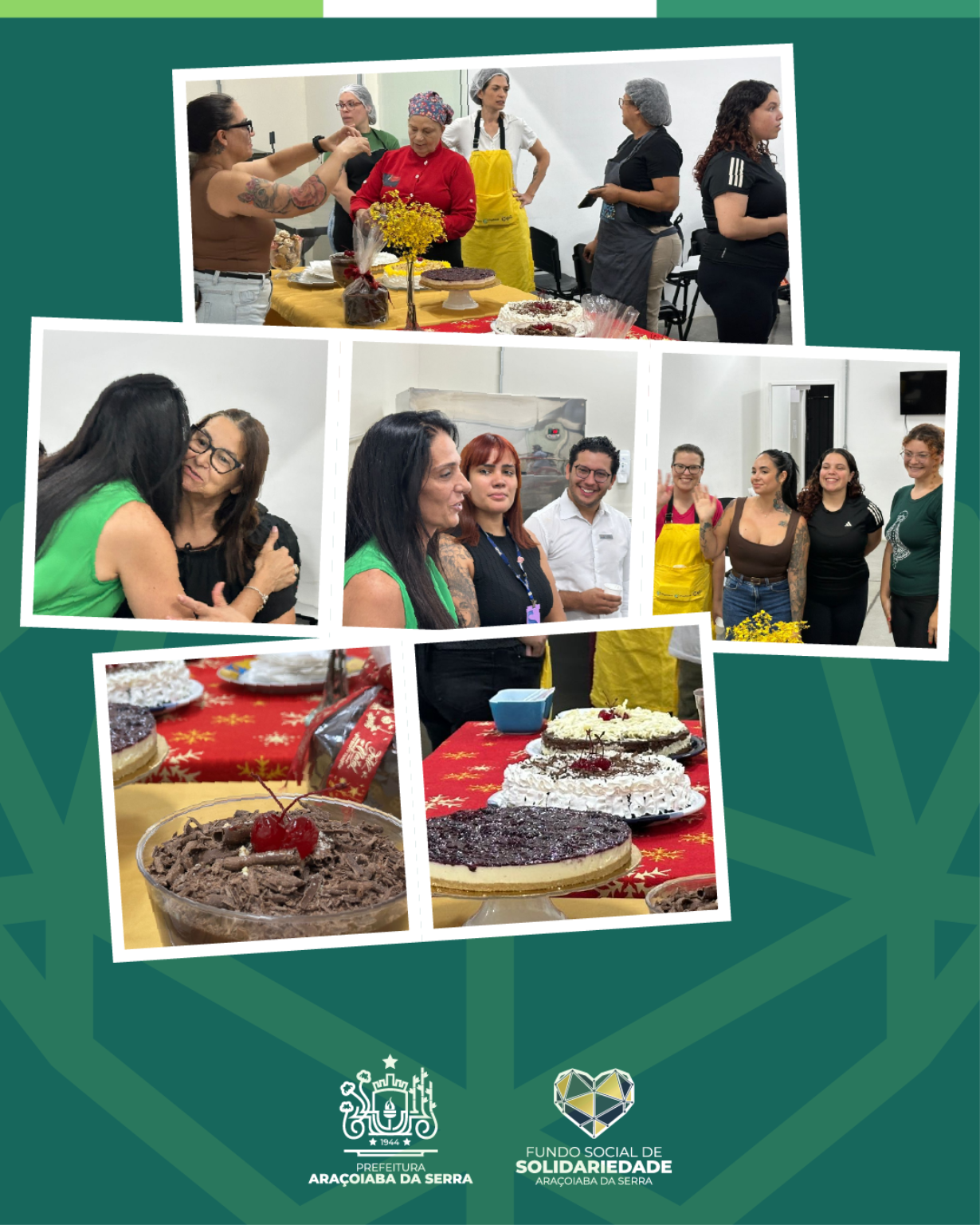 No dia 12 de dezembro (sexta-feira), o Fundo Social realizou a confraternização do curso de 60 horas, que reuniu 16 alunas. Durante o encontro, as participantes produziram tortas e bolos, aplicando na prática as técnicas aprendidas no curso de Técnicas em Confeitarias Natalinas Sebrae/Senac para a preparação e comercialização de doces. Com a conclusão do curso, todas estão agora aptas a trabalhar na área, ampliando suas oportunidades de renda e contribuindo para o fortalecimento da economia local.