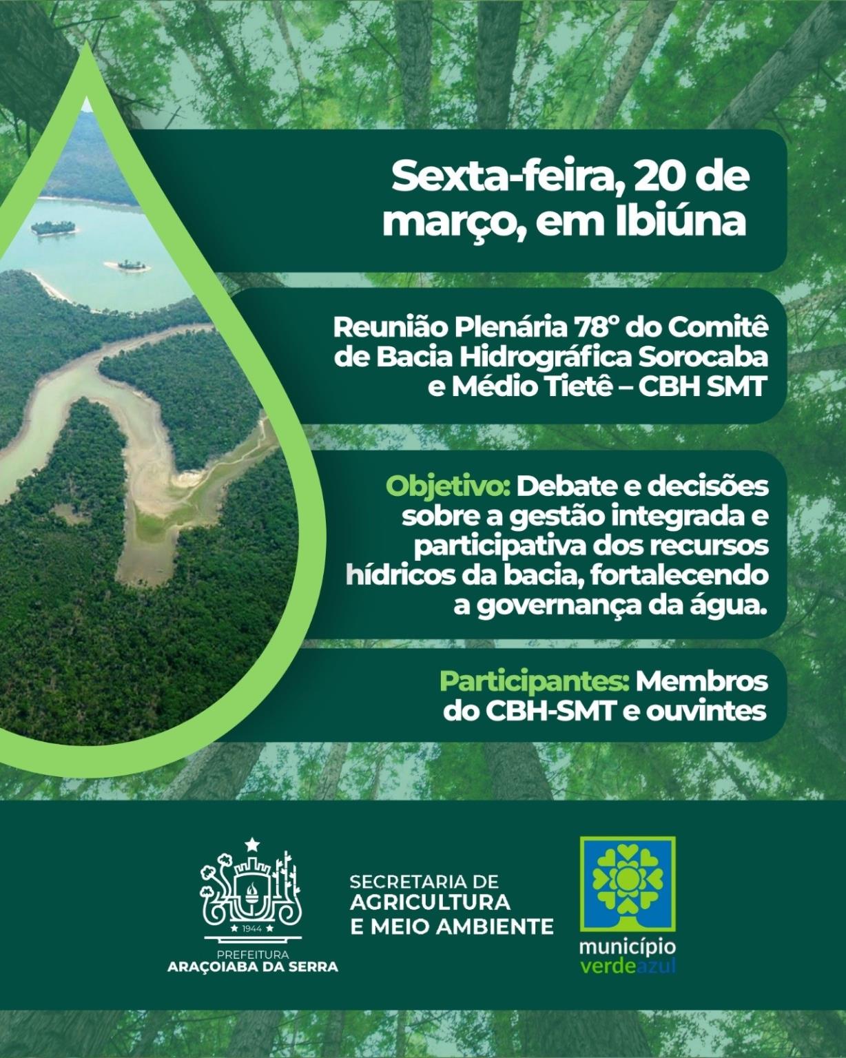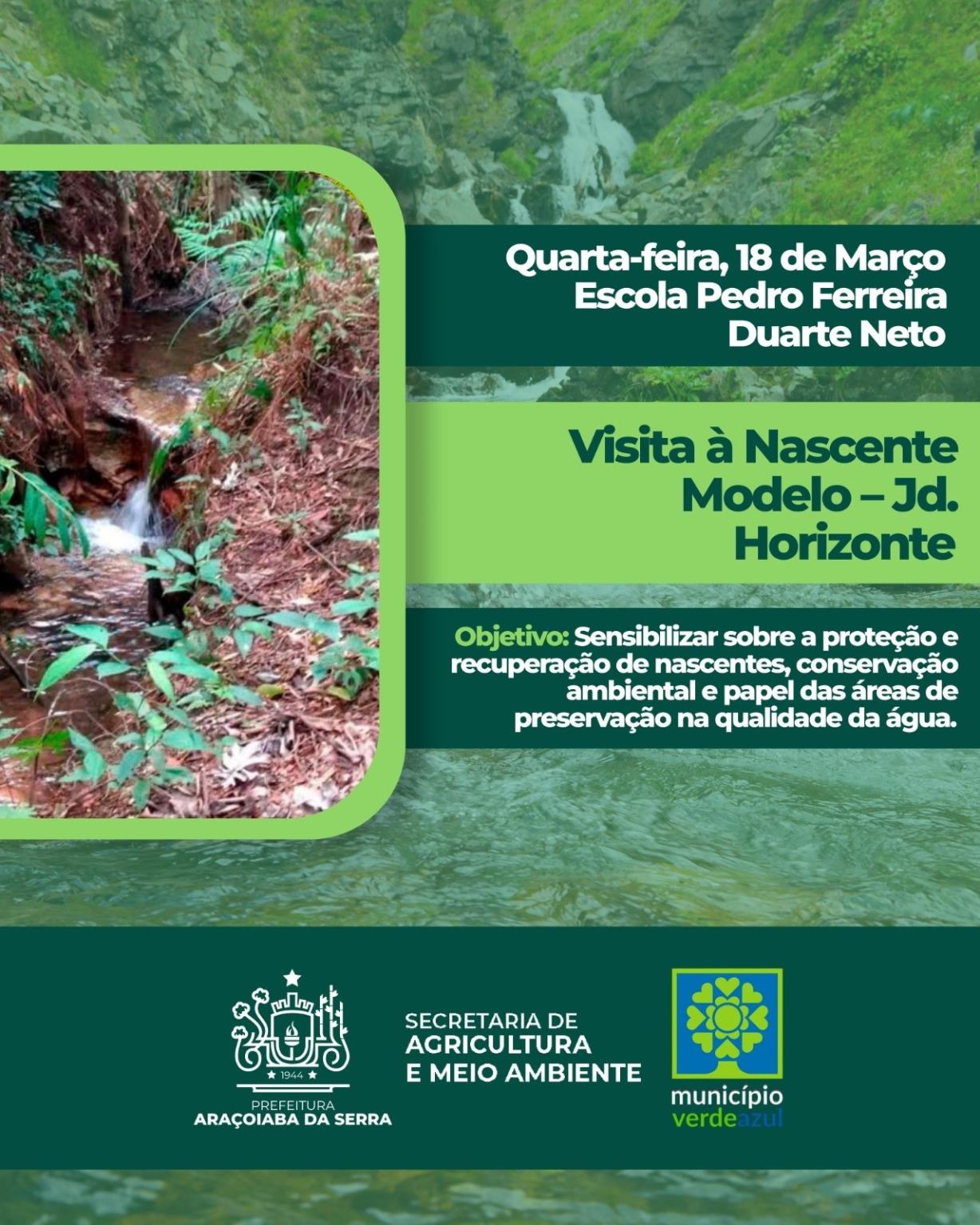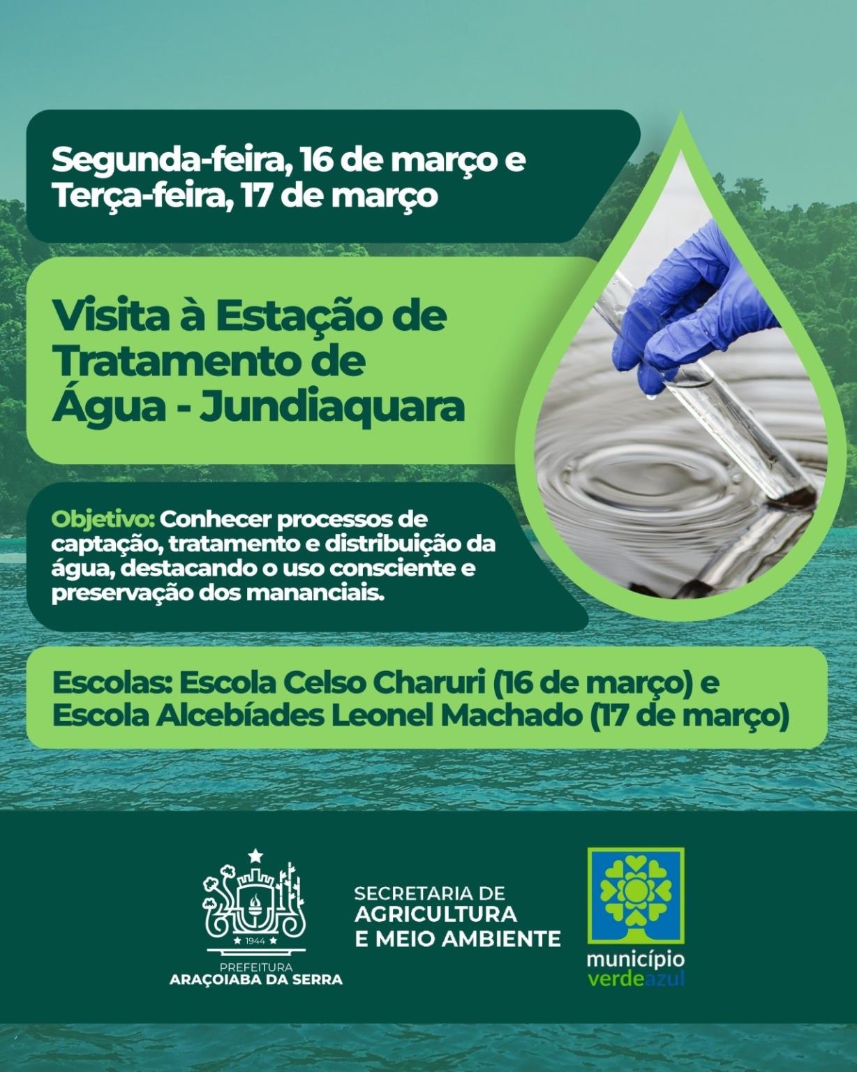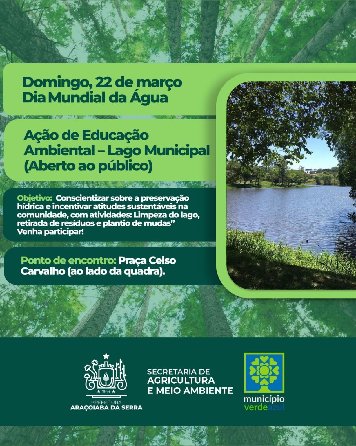 A Prefeitura convida toda a comunidade para participar da Semana da Água, que acontecerá de 16 a 22 de março, com diversas atividades voltadas à educação ambiental, conscientização sobre o uso consciente da água e preservação dos recursos hídricos. Durante a semana, estudantes e moradores terão a oportunidade de conhecer processos de tratamento da água, visitar nascentes, participar de plantio de mudas e se engajar em ações práticas de cuidado com o meio ambiente. No domingo, dia 22, o evento de encerramento terá início às 9h. A programação reforça a importância da participação de todos na proteção da água, garantindo um futuro sustentável para a cidade. Confira a programação completa no post e participe! Para mais informações, entre em contato com a Secretaria de Agricultura e Meio Ambiente pelo telefone (15) 99717-2041.